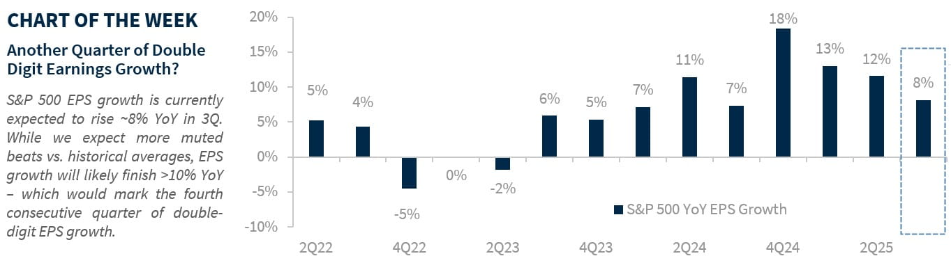 - Can Earnings Surpass A Higher Bar? | Companies face tougher expectations heading into this earnings season. Over the past 12 weeks, S&P 500 earnings estimates have ticked up 0.4%, compared to an average 3.2% cut over the last decade. Strong economic growth (Atlanta Fed GDPNow: +3.9%) should support more beats in 3Q, though these beats may be smaller than recent quarters (10-quarter average: +6.8%). However, we still expect the S&P 500 to notch its fourth consecutive quarter of double-digit earnings growth. Investors will likely focus more on top-line revenue growth than cost-cutting measures like layoffs. With valuations elevated, misses could be punished sharply—last quarter, companies that fell short lagged the broader market by 5.8% the next day by the widest margin since 2017.